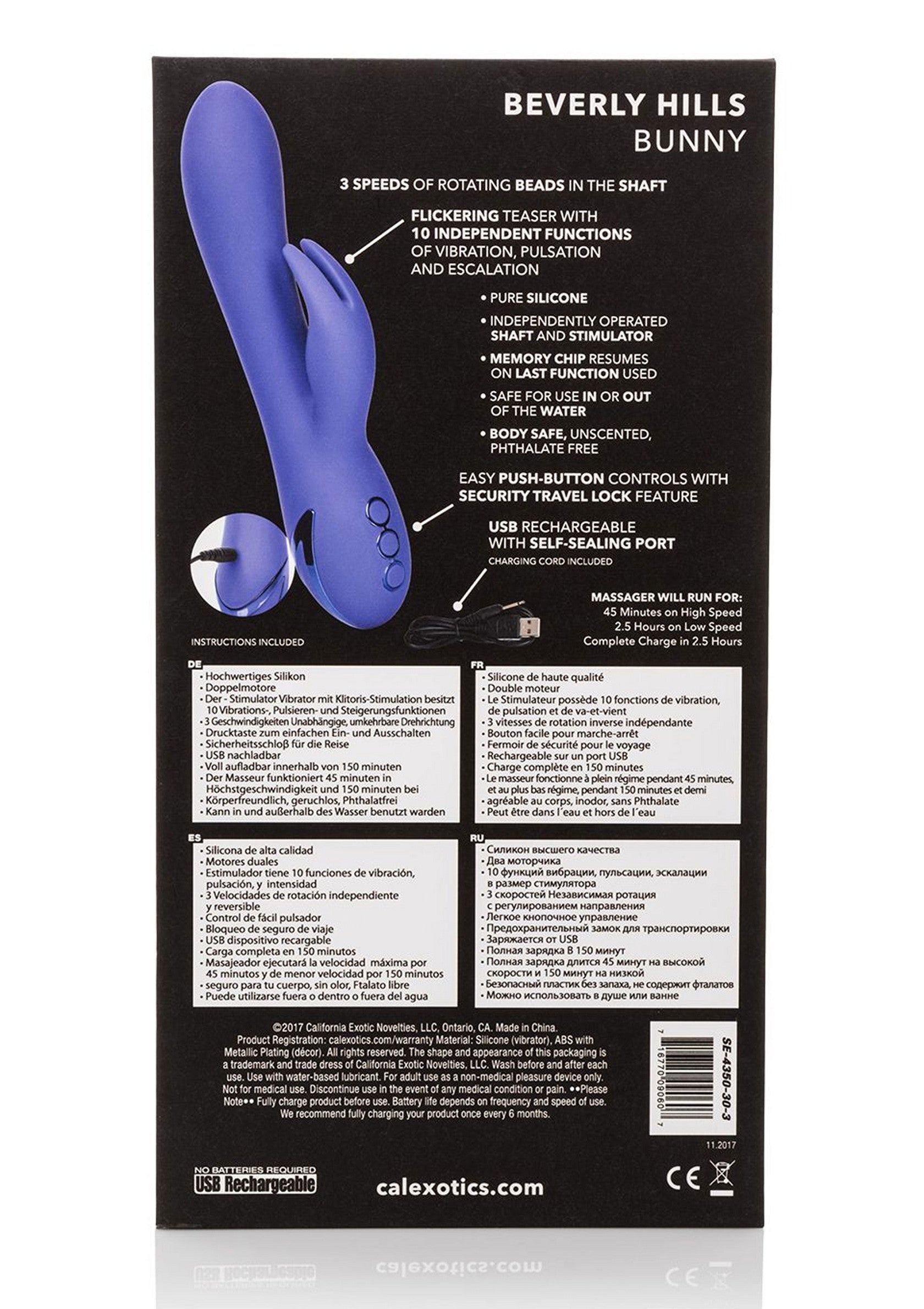 De California Dreaming Beverly Hills Bunny Vibe is een luxe rabbit vibe met 10 intense vibratiefuncties en een unieke rabbit teaser. Deze rabbit vibe is waterdicht, waardoor hij ook te gebruiken is onder de douche of in bad. Laad hem op in slechts 2.5 uur met de meegeleverde USB-oplaadkabel om te genieten van 45 minuten snelle stimulatie of 2.5 uur lage snelheidstrillingen. De vibe is gemaakt uit hypoallergene, ongeparfumeerde siliconen en is lichaamsveilig. Wij adviseren dit product te gebruiken met een glijmiddel.