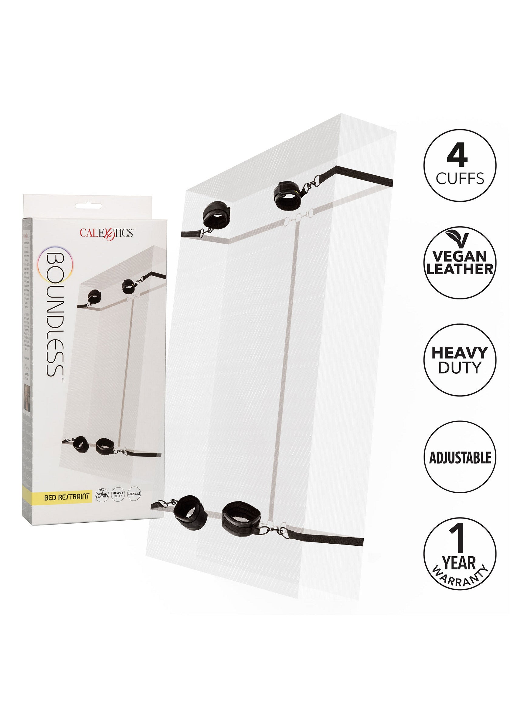 De Boundless Bed Restraint is een set handboeien en enkelboeien, die aan iedere hoek van het bed bevestigd kunnen worden. De boeien zijn dubbel gewatteerd met een binnenkant van zacht pluche. De buitenkant van de boeien zijn gemaakt van vegan leer. De zeer stevige, verstelbare bevestigingsriemen wikkelen zich onder vrijwel elk bedmatras.