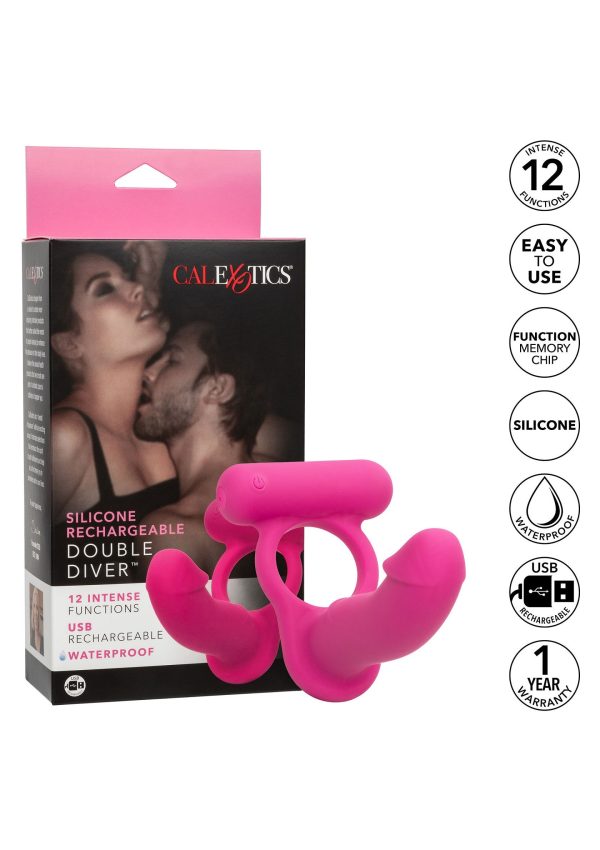 De Double Diver is een cockring in combinatie met een kleine penetrator en een mini-bulletvibe. Deze ring is dan ook uitermate geschikt voor koppelspel. Geheel comfortabel te dragen dankzij het ultrazachte TPR, wat tevens lichaamsveilig is. De Double Diver heeft een totale lengte van 10 cm en een minimale diameter van 3 cm. De mini-bulletvibe heeft 3 vibratiesnelheden en is tevens waterdicht, perfect voor genot in de douche of in bad. Wij adviseren dit product te gebruiken met een glijmiddel.